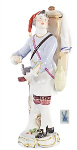 Porzellanfigur, "WASSERVERKÄUFER" aus dem Crie de Paris, MEISSEN um 1900, Entwurf von Johann Kaendeler. Porzellan weiß glasiert, feine polychrome Bemalung. Rocaillensockel mit Goldstaffage, eingeritzte Modell Nr. 60240 11AB, H = 15 cm