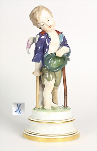 Porzellanfigur, "PUTTO als BETTLER", MEISSEN um 1880, Entwurf von Heinrich Schwaber. Porzellan weiß glasiert, feine polychrome Bemalung mit Goldrändern, eingeritzte Modell Nr. L 112, H = 22 cm, dezent restauriert !