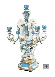 Prachtvoller französischer Kerzenleuchter, "SEVRE" Ende 19. Jhd., 2 Meerjungfrauen umspielen den zentralen Leuchterfuß, über ihre Schultern winden sich die geschnörkelten Leuchterarme, die intensive Türkisfarbe spiegelt die Farbe des Wassers wieder, Goldstaffage u. Goldränder geben dem Ganzen einen royalen Glanz, H = 63 cm, Fuß, D = 20 cm, perfekt erhalten, dieses Kleinod stand im Hotel Pariz in Prag !