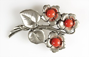 Brosche "BLUME", 1930er Jahre, Silber 835/000, 3 Korallenboutons, ca. 49 x 35 mm
