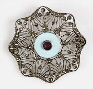 Brosche "ROSETTE" um 1900, Silber 935/000, hellblaues Emaille mit zentralem Granat, über die Drahtstege fein verteilte Markasiten, ca. D = 41,5 mm