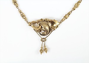 Collier, "BIEDERMEIER", Schwäbisch-Gmünd um 1830, GG 585/000, Mittelteil plastisch ausgearbeitet, zentral graviertes Blatt, 2 kl. Pampeln an einer Kette runden das Bild ab, Collier-Kette mit gleichlaufenden Elementen (plastisch gestaltet). integriertes Kastenschloss, L = 40 cm, total 13,4 g