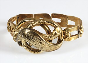 Armband, "BIEDERMEIER" um 1850/70, GG 585/000, Mittelteil brezelartig verschlungen, Oberfläche fein graviert, plastisch schön ausgearbeitet, untergebautes Kastenschloss, L = 16,5 cm