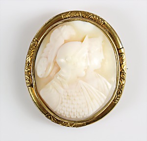 Brosche, Muschelgemme um 1840/50, Tombak mit Feuervergoldung, junges Paar nach rechts schauend, in vornehme Gewänder gekleidet, Kopfbedeckung mit Federschmuck, ca. 44,3 x 51 mm, Rand teilweise ornamentiert, (RV: kl. Reparaturstelle), ausdrucksvoll geschnitten