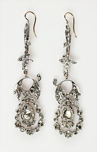Ohrhänger aus dem "BAROCK" um 1750/70, rötliches Gold unter 585/000, 74 Diamantrosen (in Silber gefasst), einzelne Elemente sind beweglich gearbeitet, H = 69 mm, (Bügel u. Bewegungen restauriert), zeittypisch, sehr schöner Zustand !