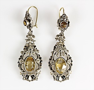 Ohrhänger, "SIEBEN-BÜRGEN" um 1870/80, Silber (geprüft), Bügel: GG 585/000, facettierte Citrine, kl. emaillierte Flächen in schwarz u. weiß, H = ca. 60,5 mm