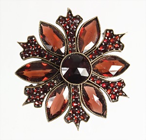 Brosche um 1890/1900, Tombak vergoldet, Rosette mit bömischen Granatenrosen ausgefasst, D = 34,5 mm, schöne Qualität !
