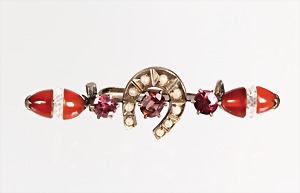 Brosche "HUFEISEN", Idar-Oberstein um 1900, Silber 800/000, Almandine, Carneole u. facettierter Bergkristall, 9 Stk. 1/2 Perlen, L = 43,5 mm
