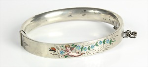 Armreif "ENGEL", 2.Hälfte 19.Jhd., Silber, liebliche Szene mit einem Putto, einem kl. Schmetterling u. Blumenband, farbig emailliert u. mit floraler Gravur abgerundet, Kastenschloss mit Sicherheitskettchen, innen: ca. 58,5 x 49,5 mm, schöner Zustand !