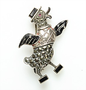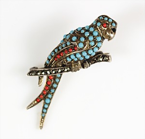 Brosche "PAPAGEI", Art-Deco um 1920/30, Silber 835/000 vergoldet, rote u. türkisfarbene Glascab., Markasiten, plastisch schön ausgearbeitet, ca. 28 x 39 mm