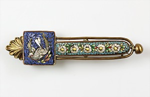 Brosche "ITALIEN" um 1880, Tombak mit Resten alter Vergoldung, feines Mosaik, mit einer weißen Taube u. Blütenornamente, das Ende ziert ein Arkantusblatt, ausgefallene asymetrische Arbeit, L = ca.67 mm