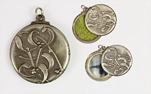 Anhänger mit Spiegel, "JUGENDSTIL" um 1900, Alpacca, typisches Mistelzweigmotiv, D = 40,6 mm