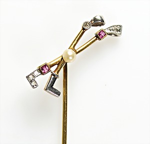 Nadel, gekreuzte "REITPEITSCHEN", ART-DECO der 1920er Jahre, GG 750/000, 5 Diamantrosen weiß, 2 Rubine im Carré-Schliff u. 1 Perle, L = 71,5 mm