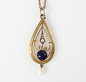 Anhänger, "JUGENDSTIL" um 1900, GG 333/000, zentraler Lapis, 3 Stk. 1/2 Perlen, als Abschluss kl. Natur-Perle, H = 39,5 mm; Kette, GG 333/000 (geprüft), kl. Kastenschloss, L = 46 cm