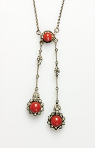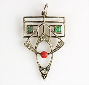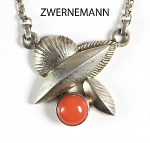 Anhänger/Collier, "ART_DECO" der 1930er Jahre, Silber 935/000, sig.: Stern (Symbol) mit Z in der Mitte (= ZWERNEMANN); Korallenbouton D = 7,6 mm, L = 44,5 cm