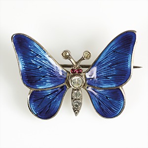 Brosche "SCHMETTERLING" um 1920/30, Silber 935/000, blaues transluzides Emaille, weißer Strass, rote Steinaugen, ca. 35,1 x 25,3 mm. Ausdrucksstark !