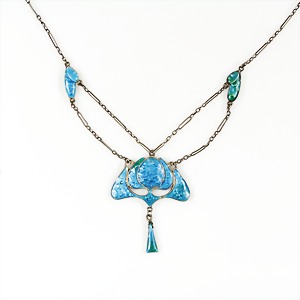 Collier, "JUGENDSTIL" um 1900, Silber (geprüft), unsiegniert, event. von CHARLES HORNER ? Vorwiegend blaues transluzides Emaille mit grünen Akzenten, beidseitig emailliert, Knebel-Schließe, L = 43 cm