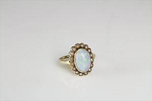 Ring um 1900, GG 585/000, zentraler Opal-Cabochon (12 x 8,3 mm), 16 St. 1/2 Perlen im Kranz, RW. ca. 54,5-55, mit Schatulle