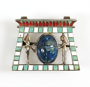 Brosche "JUGENDSTIL" um 1900/10, Silber 800/000, Emaille in grün, weiß, u. roten Farbtönen, zentraler Skarabäus in Lapis geschnitten, Brosche im ägyptisierenden Stil gearbeitet, ca. 32,8 c 25,7 mm