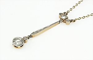 Anhänger, ART-DECO um 1920/30, GG 585/000, 1 zentraler Altschliffdiamant ca. 0,25 ct weiß, 5 Diamant-Rosen alle weiß gefasst, H = 30 mm; Kettchen GG 585/000, L = 46,5 cm