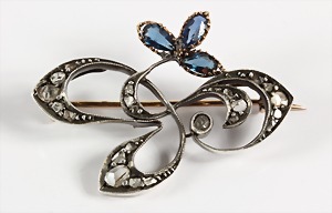 Brosche "JUGENDSTIL" um 1890/1900, GG 750/000, 22 Diamantrosen (weiß gefasst), 3 Saphirtropfen (facettiert) ca. 1,0 ct, Maße: ca. 39 x 27 mm, mit Schmuckbox ! Rückseitig eine alt restaurierte Stelle !
