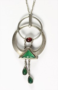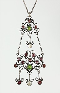Anhänger/Collier, "JUGENDSTIL" um 1900/10, Silber (geprüft), böhm. Granate, 2 grüne facettierte Steine, 2 Perlen, unterer Teil an Kette aufgehängt, kl. Hängerchen sind beweglich, H = 85 mm; gedrehte Kette, Silber 835/000, L = 45 cm