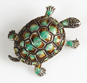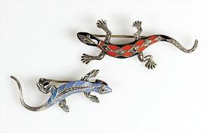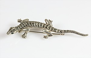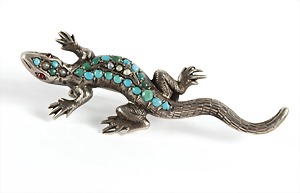Brosche, "SALAMANDER", 1930/40er Jahre, Silber 835/000, sig.: H&S oder M&S (Punze undeutlich !), Türkise u. 1/2 Perlen, rote Steinaugen, plastisch schön ausgearbeitet, unter der Broschierung sind Ösen für eine KetteL = 56,5 mm