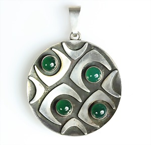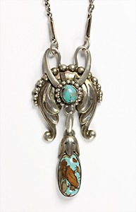 Collier/Anhänger, "JUGENDSTIL" Kopenhagen um 1913, Silber 830/000, sig.: KBS (Kay Bojesens Solvsmedie), Anhänger aufwendig gestaltet, 2 Türkiscabochons (mit Matrix), vorne H = ca. 64,5 mm; Kette, L = 43 cm, ungewöhnliches Stück !
