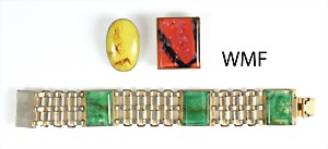 Lot, "IKORA WMF", Metall weißfarben, 1 Armband mit Kastenschloss, 3 grüne Glassteine, B = 24 mm, L = 19,2 mm; 2 Kleiderclips: 1 x rot/schwarzes Glas 34 x 28,7 mm, 1 x gelb/rotes Glas 22,7 x 34,7 mm