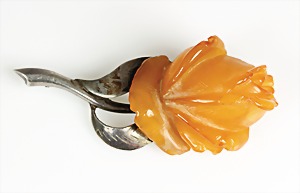 Brosche "ROSE", Bernstein "BUTTERSCOTCH", Silber 835/000, sig: SBM 835, Bernstein als Rosenblüte vollplastisch geschnitten, L = 74,6 mm, total 9,2 g