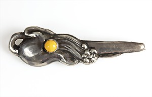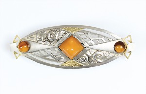 Brosche "JUGENDSTIL", Nancy um 1900, Silber, sig; J.MARCNANDOT u. Meistermarke, Bernstein "BUTTERSCOTCH", mittig in pyramidenform, seitlich 2 Cabochons, dezent integrierte Goldelemente, Maße ca. 67,6 x 23,9 mm