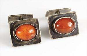 1 Paar Bernstein-Manschettenknöpfe, Silber 355/000, sig.: Symb. Fisch ("FISCHLAND"), ca. 19,4 x 16,5 mm