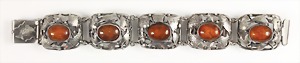 Bernsteinarmband, Silber 835/000, sig: GK Georg Kramer ("FISCHLAND"), 5 Bernsteincab. ca. 11,5 x 15,5 mm, diese sind von Seemotiven umgeben: Fische, Seesterne, Möven, ein Schiff u. ein Leuchtturm, Klappschließe, L = ca. 20 cm