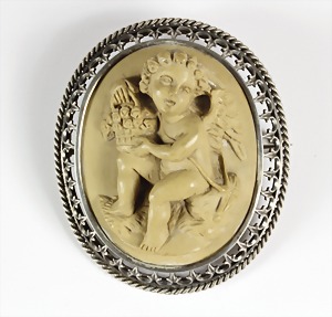 Brosche Italien um 1860/80, Silber (geprüft), sig.: CB, in Lava geschnittener "PUTTO" mit einem Blumenkorb, vollplastisch ausgearbeitet, durchbrochener Galeriedraht rundet das Bild ab, Brosche: 47,2 x 55,5 mm