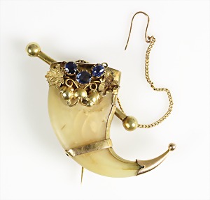 Brosche um 1870/80, GG 585/00 (geprüft !), 3 Saphire (facettiert), wohl "Tigerkralle", Sicherheitskettchen, ca. 43 x 36 mm