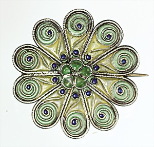 Brosche "ROSETTE", 1920/30er Jahre, Silber 925/000, sig.: Anker (Symbol) "Hegermann Ag Peine", durchscheinendes Emaille in gelb, gün u. ultramarine blauen Farbtönen, "blique a jour", D = 34 mm