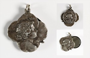 Anhänger, "JUGENDSTIL" um 1910, Silber 800/000, beidseitiges Damenportrait, innen liegend ein Spiegel, der durch Wegdrehen der beiden Flächen sichtbar wird, D = ca. 30 mm
