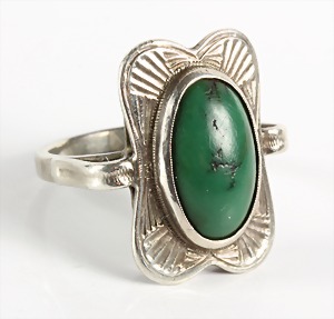 Ring "JUGENDSTIL" um 1900/10, Silber 800/000, sig.: ER, grüner Steincabochon, Ringkopf ca. 22 x 14,5 mm, RW ca. 54,5