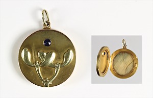 Medaillon, "JUGENDSTIL" um 1900, GG 585/000, Mistelzweige und 1 blauer Stein ziehren die Sichtfläche, D = 22,5 mm, H = 4,4 mm, schwer gearbeitet ! total 7,0 g