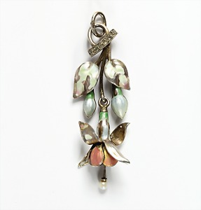 Anhänger, "JUGENDSTIL" um 1900/10, Silber 900/000, unsigniert, zartfarben emaillierte Blüte, Knospen u. Blätter (Emaille mit Abplatzern), 6 weiße Steine, H = 54,5 mm, charmantes Schmuckstück, mit Schatulle !