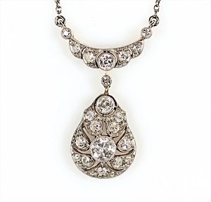 Anhänger, feines "ART-DECO" der 1920er Jahre, insgesamt 26 Diamanten weiß, total ca. 0,85 ct , davon zentraler Altschliff-Diamant ca. 0,30 ct weiß/getöntes weiß, alle Steine in Platin gefasst, Unterbau in GG 585/000, H = 27,5 mm, B = 16,4 mm; Dazu eine passende Platinkette mit Federring, L = 43,2 mm, der Anhänger ist ausgewogen gestaltet und in einem sehr guten Erhaltungszustand !