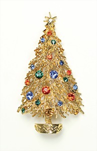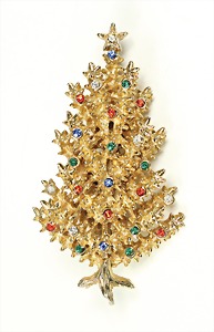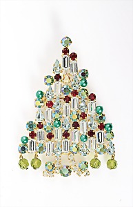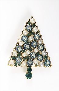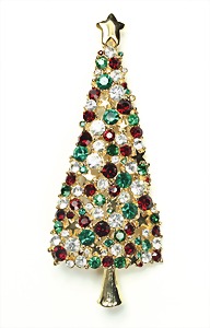 Weihnachtsbaum-Brosche USA 1950/60er Jahre, goldfarben, signiert: WEISS; weiß, rot u. opalisierende Strasssteine, grüne Kunst-Perlen, grün facettierte Kugeln (beweglich), ca. 76,5 x 52,5 mm