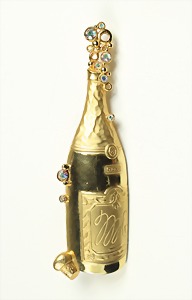 Große Brosche in Form einer Champagnerflasche, goldfarben, signiert: JJ (Jonette Jewelry, USA), originelle Brosche mit opalisierenden Strasssteinen, ca. 97,5 x 27,5 mm