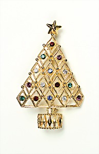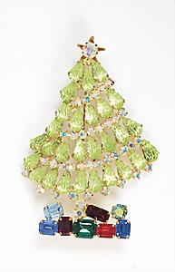 Weihnachtsbaum-Brosche USA 1950/60er Jahre, goldfarben, signiert: WEISS, zu Füßen "Geschenkpäckchen" in leuchtend intensiven Farben, opalisierende Strasssteine, grüne, gravierte Glastropfen, ca. 83 x 58 mm