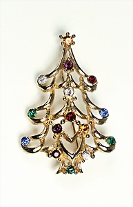 Weihnachtsbaum-Brosche, goldfarben, signiert: MONET, geschwungene Zweige besetzt mit farbigen Strasssteinen, ca. 50,5 x 35,6 mm