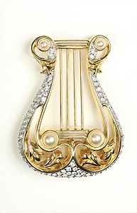 Brosche von "SWAROWSKI" in Form einer Harfe, goldfarben, signiert: Schwanenpunze, klare Strasssteine, 4 Kunstperlen, plastisch schön ausgearbeitet, ca. 60 x 44,8 mm