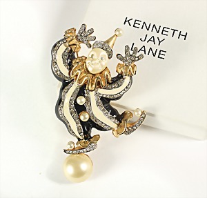 Brosche "HARLEKIN", goldfarben, signiert: Kenneth Jay Lane, schwarzes u. weißes Emaille, harmonisch integrierte klare Strasssteine mit Kunstperlen, schön ausgearbeitet, ca. 63,8 x 40,5 mm, (mit orig. Schatulle), Sammlerstück !