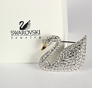 Brosche "SCHWAN" von "SWAROWSKI" weissfarben, signiert: mit Schwanenpunze, besetzt mit klaren Strasssteinen, ca. 31 x 25,5 mm, (mit orig. Schatulle)
