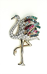 Brosche "STRAUSS", goldfarben, unsigniert, klare Strasssteine, farbige Carré-Steine in Rot,Grün u. Blau, plastisch schön ausgearbeitet, ca. 54 x 33,5 mm