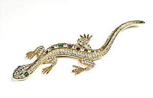 Sehr große "EIDECHSEN"-Brosche, goldfarben, unsigniert, klarer Pavé-Strass u. vereinzelt größere, farbige Strasssteine, ca. 142 x 45 mm
